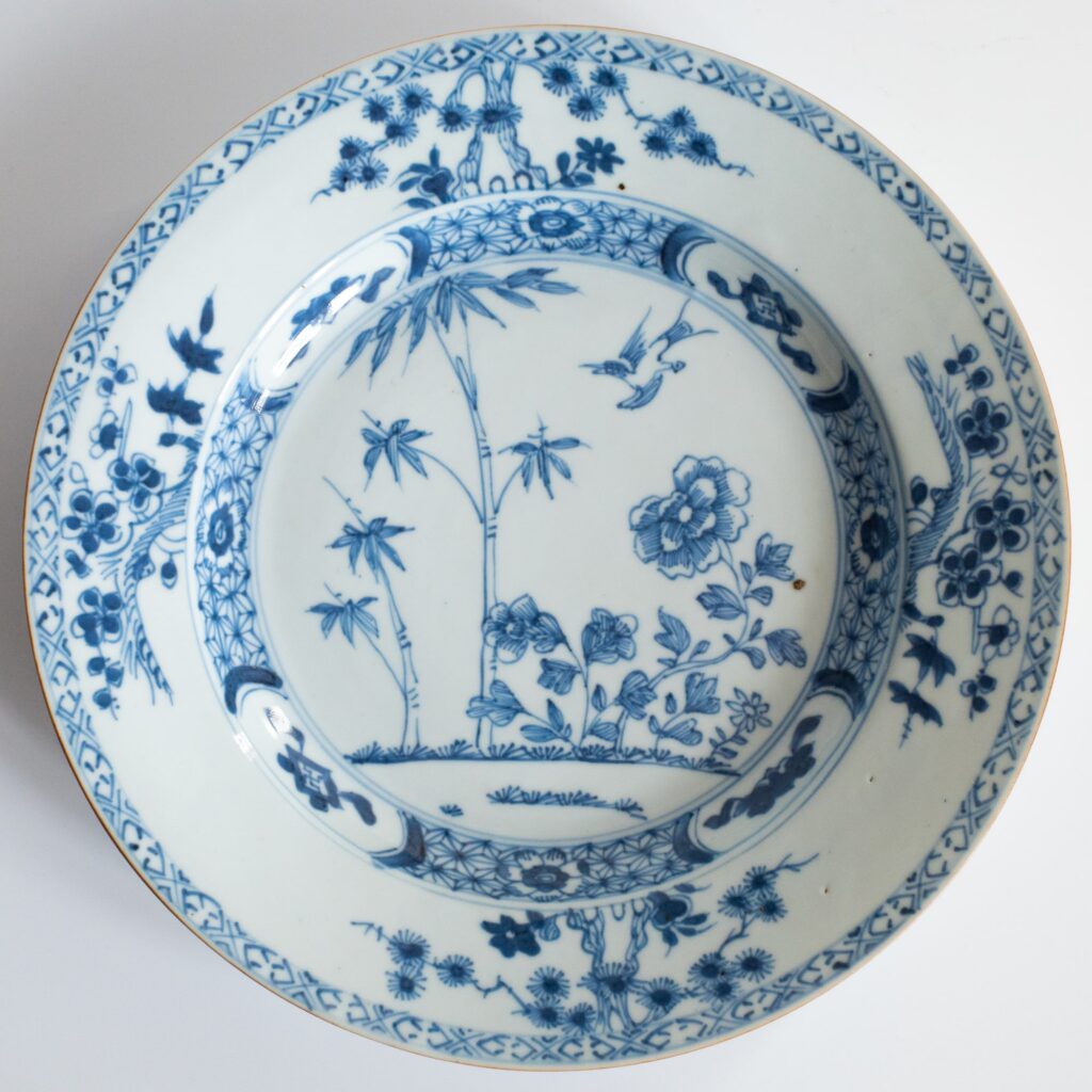 Antique Chinese blue and white export porcelain dish depicting a scene with a bird and flowers, surrounded by two diaper borders and with alternating prunus and pine trees between them. Lovely piece of 18th century Chinese export porcelain. Diameter: 22.2 cm.