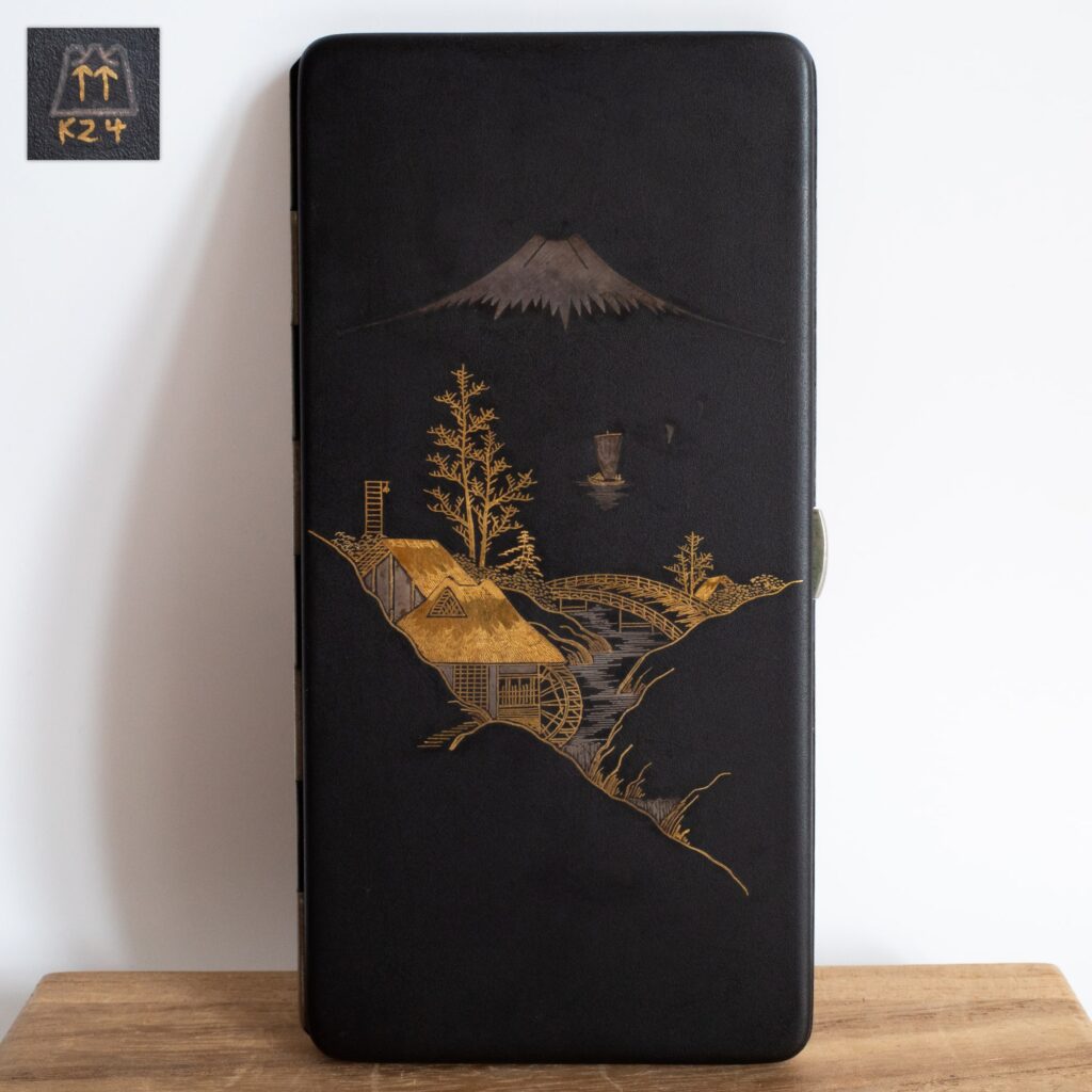 Fine antique Japanese damascene cigarette case with silver and gold decoration depicting a classic landscape scene with Mt. Fuji in the background on one side and a group of butterflies on the other. Marked ‘K24’ and with an unknown stylized Mt. Fuji logo featuring two arrows inside. Comes with a wooden storage box. Dimensions: approx. 16×8 cm..