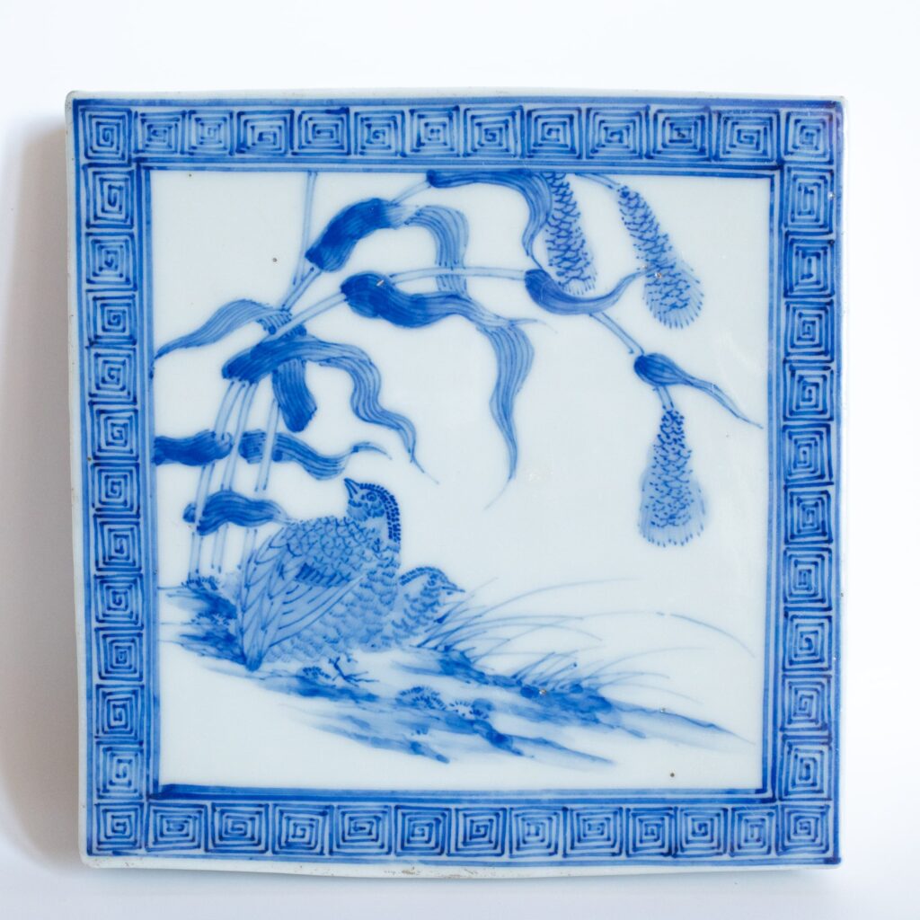 Finely hand-painted antique Japanese Seto porcelain tile depicting a pair of quails. Combination of quails and standing grain is a visual rebus that can be interpreted as ‘peace and harmony’. Dimensions: 15×15 cm