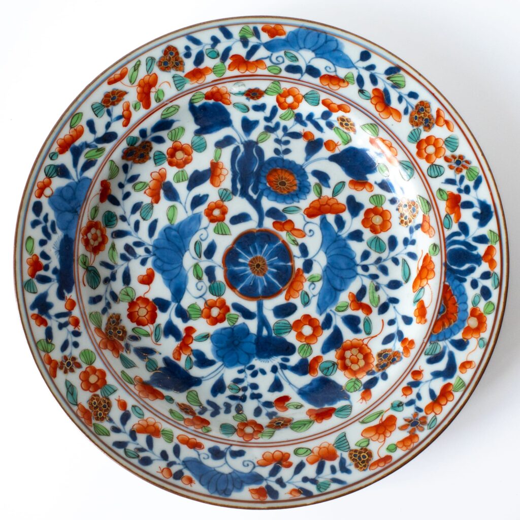 Rare antique Chinese blue and white porcelain dish decorated with typical ‘flower basket’ pattern and marked with rectangular underglaze blue mark inside a double circle. Floral polychrome overglaze decoration added later in Europe. Diameter: 21 cm
