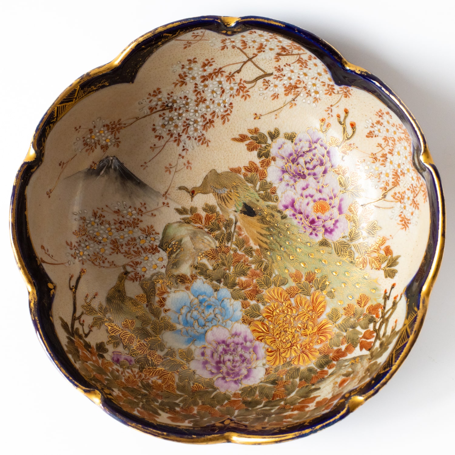 Fine antique Japanese cobalt-ground flower shaped Satsuma pottery bowl with nicely painted scene depicting a pair of peacocks surrounded by flowers and with Mt. Fuji visible in the background. Signed to the base. Diameter: 15.5 cm.