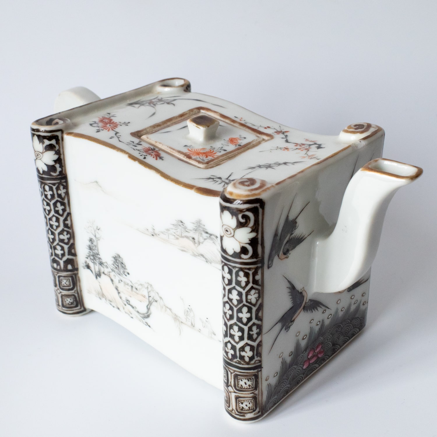 Rare late Qing Dynasty or Republic period qianjiang enamelled teapot of stylized rectangular form featuring partially unrolled scrolls with landscape scenes and swallows flying above the rolling waves. Such a unique piece, never seen one quite like it before! Height: 9 cm.