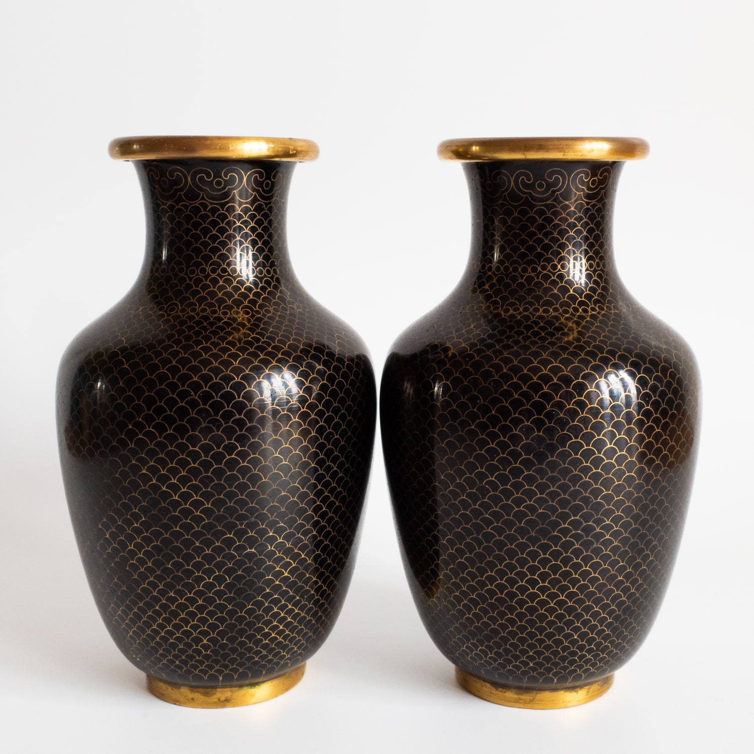Attractive early 20th century Chinese black monochrome cloisonne enamelled gilt copper vases decorated with a classic fish scale pattern framed by ruyi border around the rim. Height: 13 cm.