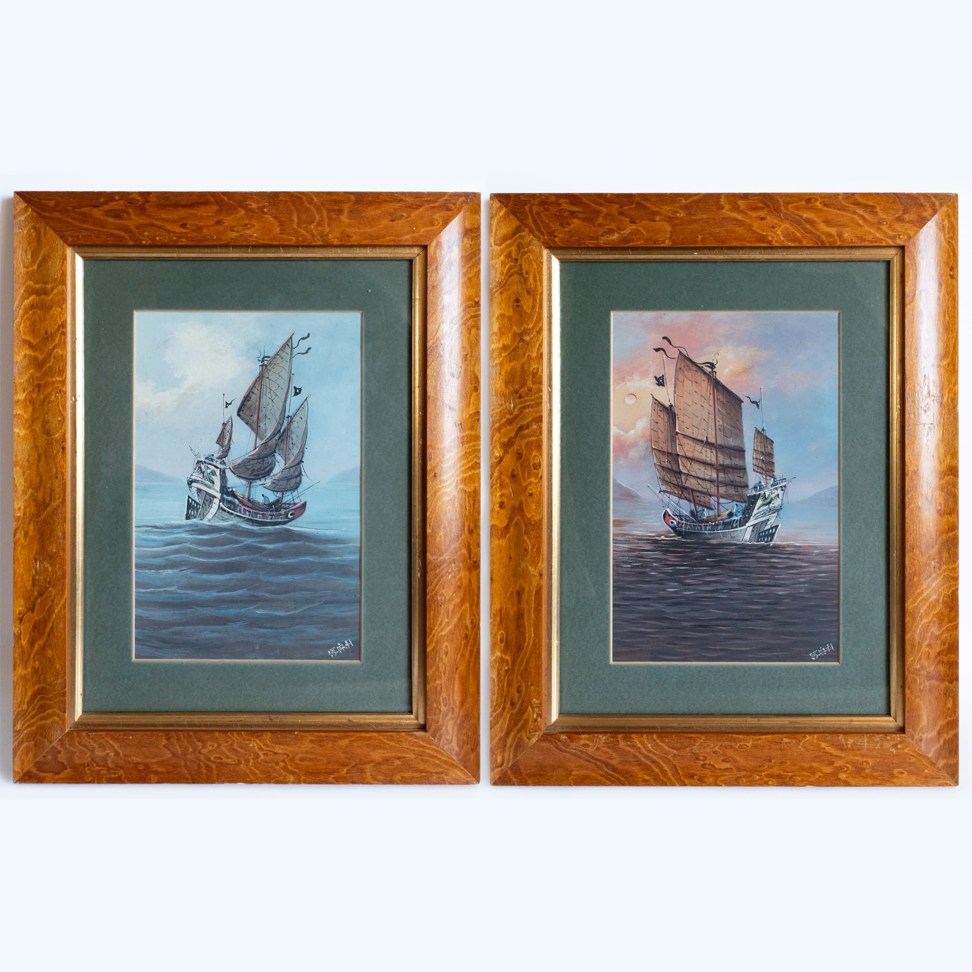 Wonderful pair of vintage Chinese / Hong Kongese gouache paintings depicting scenes with traditional junks. Each signed in the lower right corner and very nicely framed. Each frame measures 42.5×33.5 cm. Each artwork measures 25×16.5 cm.