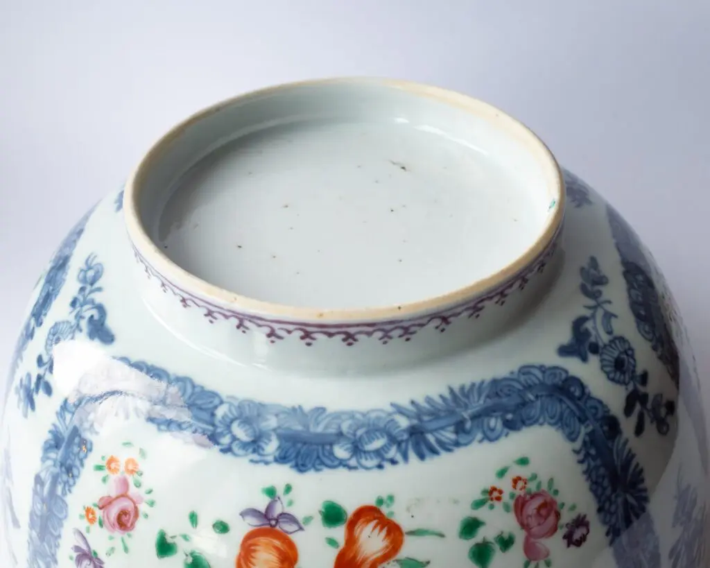 A Qianlong period punch bowl decorated with underglaze blue and overglaze famille rose enamels, later 18th century.