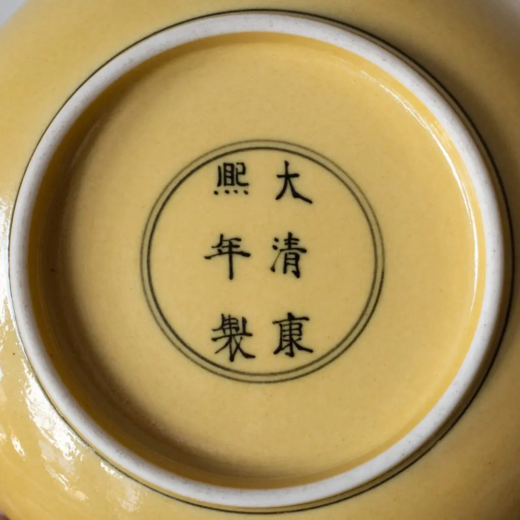 Later 20th century yellow-ground saucer with a pair of dragons. Marked with a six-character underglaze Kangxi reign mark inside double circles.